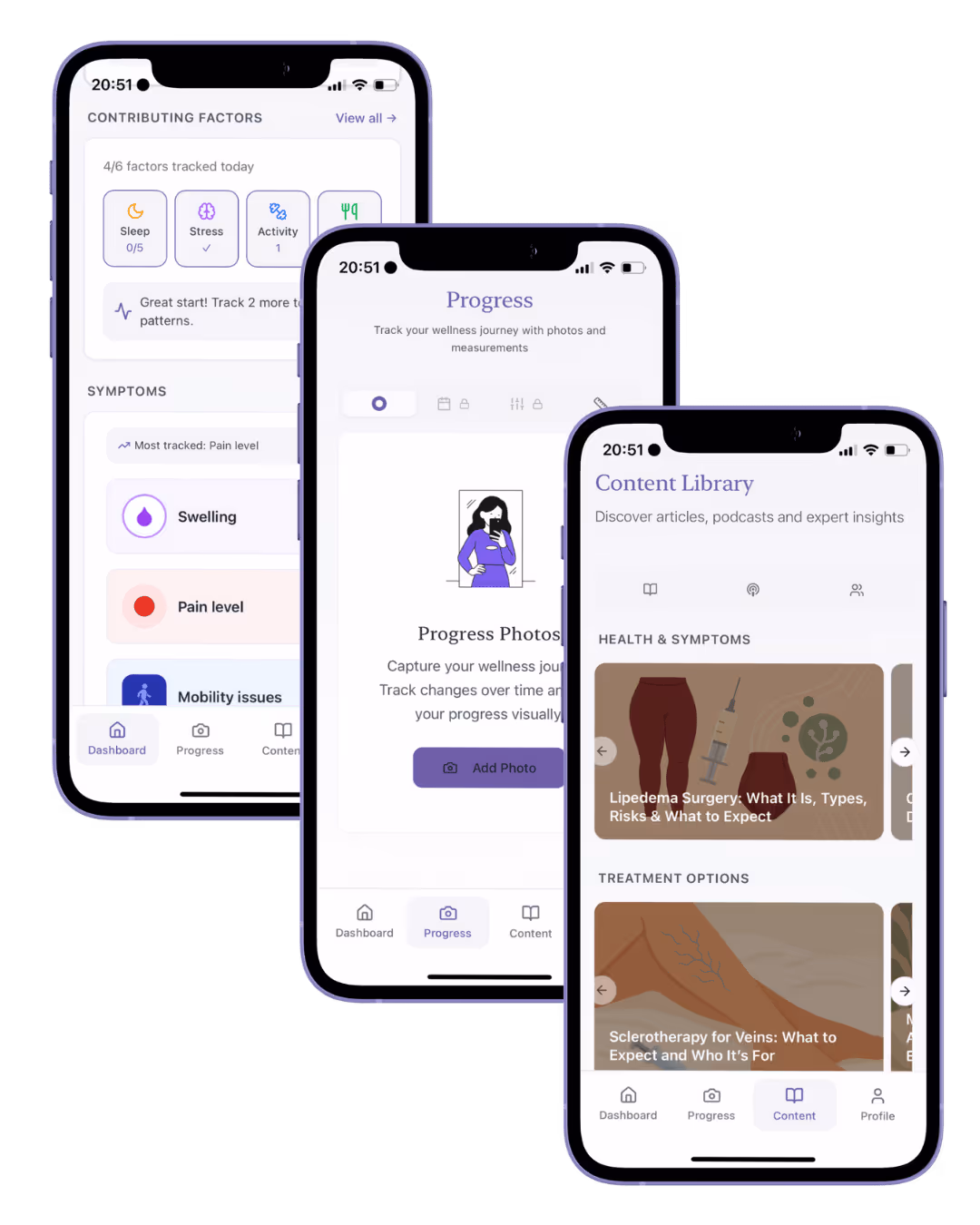 Renya konzentriert sich stark auf die Faktoren, die unserle Lipödem-Beschwerden beeinflussen. Sei es Zyklus, Stress-Level, bestimmte Lebensmittel oder die tägliche Aktivität. Zu Beginn kannst du festlegen, welche kleinen Ziele du dir setzt - wie etwa 15 Minuten am Tag Cadiotraining oder Trockenbürsten vor dem Duschen.